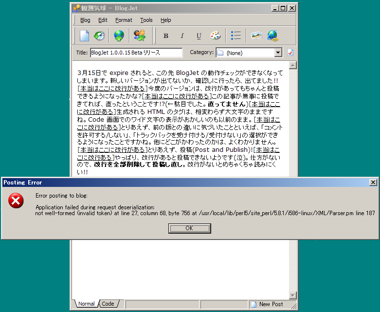 新しいのが出ました。が、依然として、改行があると投稿できません。 というか、改行なしでも投稿できなくなってしまいました。駄目駄目。